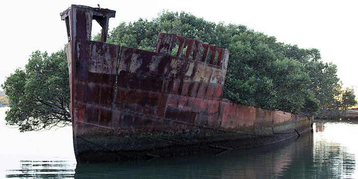 Le SS Ayrfield fait partie des nombreux bateaux que l’armée australienne a désarmés et laissés à l’abandon près de la Homebush Bay, sauf que ce bateau là a quelque chose de différent… Une forêt pousse sur celui-ci !
