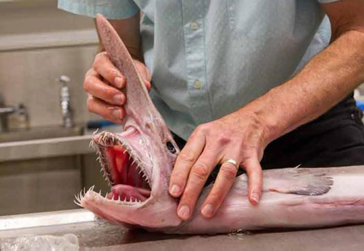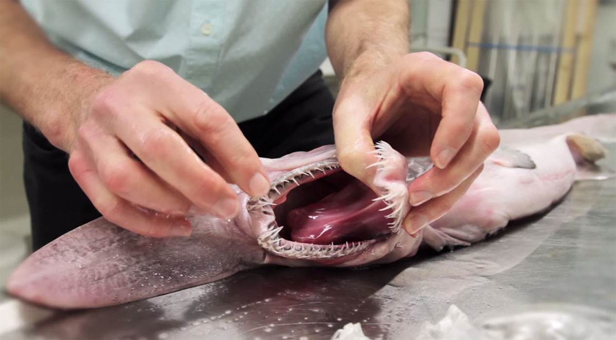Le Mitsukurina owstoni ou requin-lutin est une créature impressionnante qui vient d’être pêchée dans les alentours de l’Australie (sur les côtes d’Eden entre Melbourne et Sydney). Tout de suite, l’Australian Museum l’a récupéré pour pouvoir étudier un spécimen aussi rare. « Ce n’est pas courant d’en attraper un et il est d’ailleurs assez rare de croiser cet animal », explique Mark McGrouther. Le musée ne possédait alors que trois de ces requins. Cet Alien des abîmes vit comme son nom l’indique dans les profondeurs des océans Pacifique, Atlantique et Indien. Reconnaissable à son nez aplati, il a un corps rose et flasque, et des dents très pointues et effrayantes. Les scientifiques ont donc pu examiner ce jeune mâle encore immature et ne mesurant pas encore les 4 mètres que ses confrères peuvent atteindre à l’âge adulte.