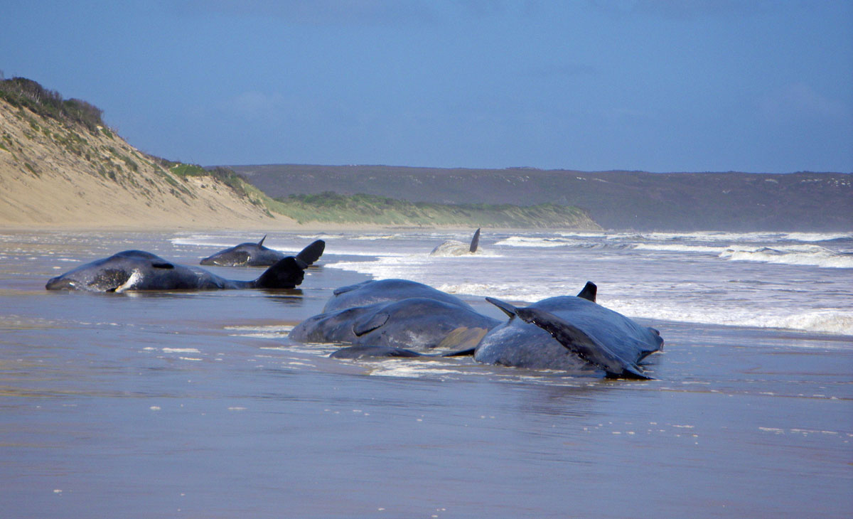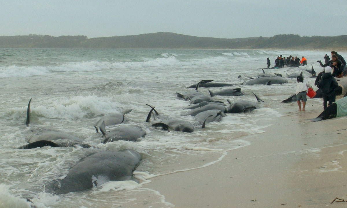 Il existe un endroit, à l’un des points les plus méridionaux de l’île sud de la Nouvelle-Zélande, baptisé Farewell Spit (la Pointe de l’Adieu), tristement célèbre pour le nombre d’échouages de cétacés ayant eu lieu sur cette avancée de sable. Pas plus tard qu’en février 2015, pas moins de 200 baleines-pilotes, aussi appelées globicéphales, sont venues s’y échouer. Les sauveteurs ont réussi à remettre à la mer une centaine d’entre elles, mais environ la moitié de celles-ci sont retournées s’échouer de plus belle ; sans eau pour supporter leurs corps, les cétacés meurent lentement asphyxiés, écrasés sous leur propre poids qui les empêche de respirer.