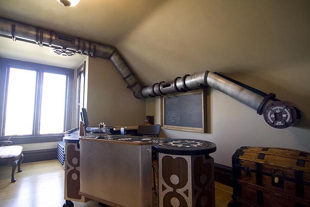 La firme Because We Can, dirigée par l’architecte Jeffrey McGrew et sa femme designer d’intérieur Jillian Northrup, a eu la mission de relooker une pièce pour en faire un lieu propice au travail et à la concentration. Et on peut dire qu’il n’est pas toujours facile de se concentrer si on a un chat à la maison ! Le pari a pourtant été tenu, et la pièce s’est transformée en une sorte de tanière/bureau de recherche pour savant fou aux mille références à l’univers de la science en général. Et au milieu de cette ambiance très steampunk, la firme a eu l’idée follement ingénieuse de moderniser une plomberie vétuste en la transformant en un moyen de locomotion pour chat : le Cat Tube.