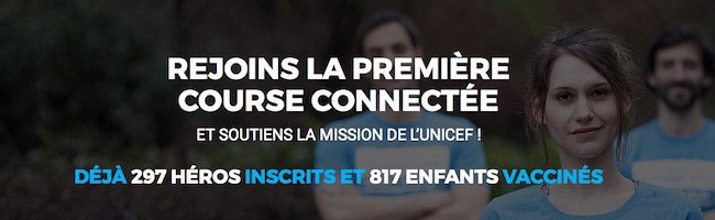 Serez-vous prêt à chausser vos baskets le 19 avril prochain ? L’objectif, réunir un maximum de coureurs au profit du programme de vaccination de l’UNICEF lors de la première course connectée du monde ! Vous n’aurez plus besoin de courir de manière isolée et le bénéfice de vos efforts sera double puisqu’il s’agira de courir pour maintenir votre condition physique mais surtout pour contribuer à la campagne “Objectif 100%, Vaccinons chaque enfant”.