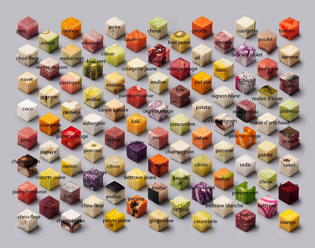 Ce travail artistique mélange les saveurs, les goûts et les couleurs de 98 aliments découpés de manière ludique en petit cubes. Toutes les catégories sont représentées, des fruits, des légumes, du poisson et de la viande disposés à égale distance pour un effet visuel garanti.
