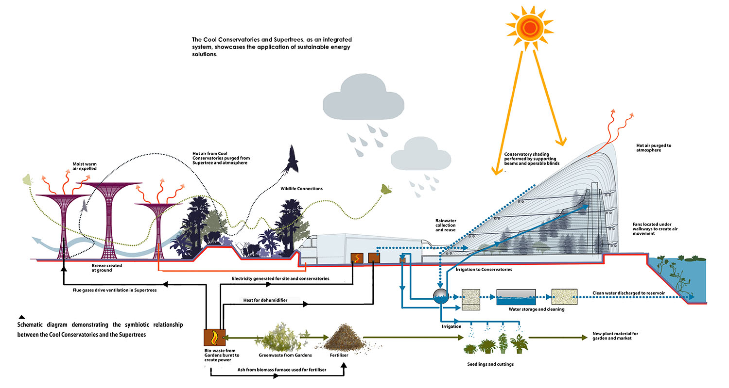 L’endroit est composé de trois jardins dont les actions sont interdépendantes : chacun alimente les deux autres d’une manière particulièrement ingénieuse. Le plus grand espace vert, Bay South, avec ses 54 hectares, surclasse largement les deux autres ; le Flower Dome et le Cloud Forest, grands respectivement de 1,2 et 0,8 hectare. Mais chacun, par sa composition et ses apports énergétiques, participe au bon fonctionnement des autres.