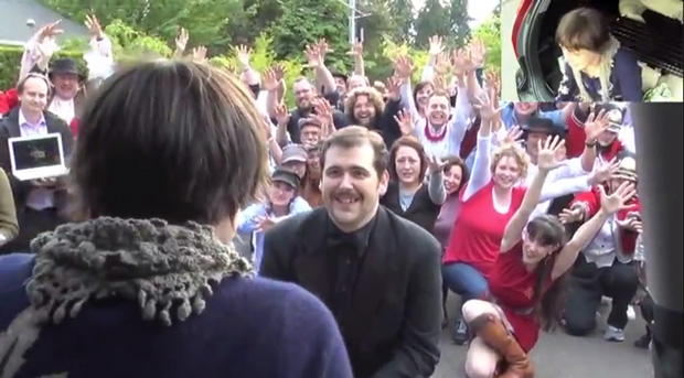 Avant de mettre un genou à terre, Isaac Lamb a invité sa dulcinée à s’asseoir dans le coffre d’une voiture et à placer un casque sur ses oreilles. Jusqu’ici, on pourrait penser que cela manque de romantisme. Et pourtant, tandis que le véhicule démarre, amis et famille prennent place et se lancent dans une chorégraphie sur la chanson Marry You de Bruno Mars. Après quelques minutes, le cortège s’écarte pour qu’Isaac fasse son apparition et s’agenouille enfin pour faire sa demande ! Ce lip dub, filmé en direct et en pleine rue, a déjà ému plus de 3 millions d’internautes ! Et vous ?