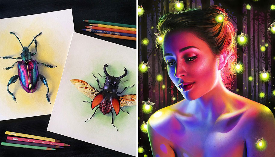 Morgan est une jeune femme de 22 ans qui adore utiliser des crayons de couleur pour dessiner. Mais détrompez-vous, elle ne fait pas de simples coloriages. Cette artiste utilise toute une palette de couleurs pour donner vie à des dessins hyperréalistes. Ses illustrations vont des portraits fantaisistes aux animaux tout droit sortis d’un arc-en-ciel en passant par des insectes de contes de fées. Découvrez ces créations surprenantes et pleines de gaieté.