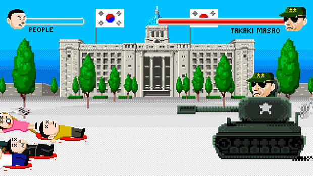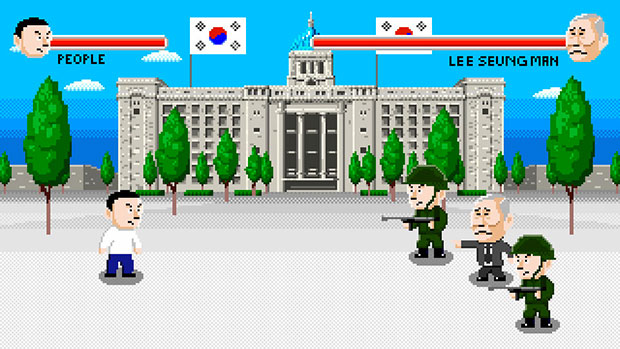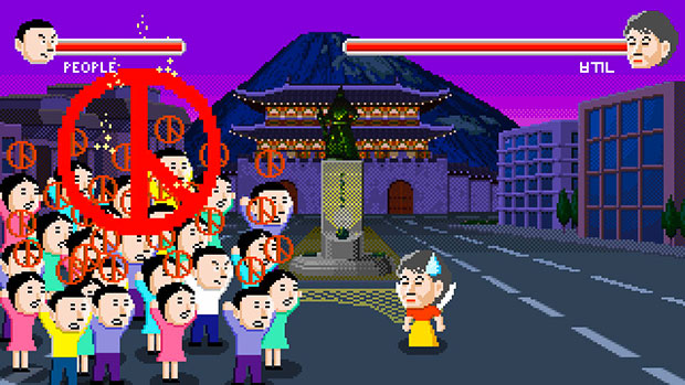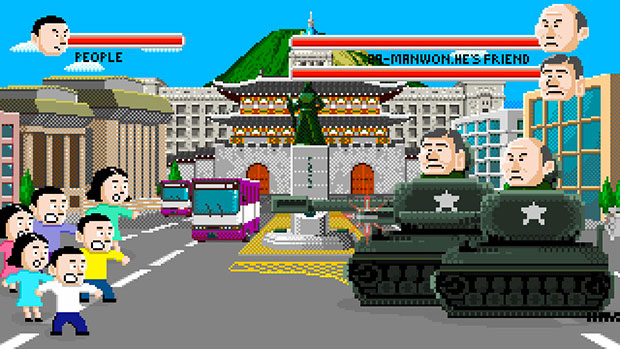 Il faut bien avouer que cette vidéo tombe à pic après les montages réalisés à des fins de propagande par le gouvernement nord-coréen il y a quelques semaines. Nommée “Democracy DEMO“, elle présente un jeu totalement fictif réalisé par le studio Shelter à Séoul. Les protagonistes qui ont marqué l’histoire du pays sont présents (le président Syngman, Park Chung-hee, Chun Doo-hwan, …) ainsi que ses évènements majeurs (émeutes, meurtres et répression…).
