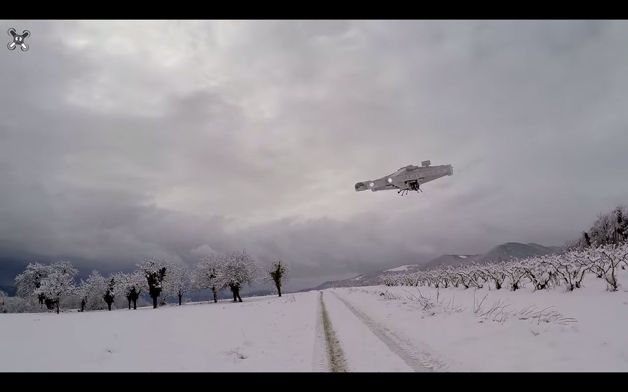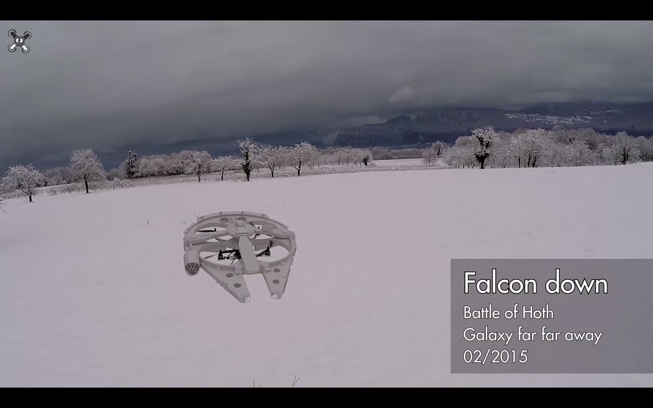 L’illusion est particulièrement amusante lorsque l’on voit ce Faucon Millenium, réalisé à partir d’une simple coque de mousse sculptée collée sur un drone quadricoptère, voler au-dessus de paysages enneigés ressemblant à la planète Hoth de L’Empire contre-attaque. Olivier C n’a d’ailleurs pas l’intention d’en rester là puisque son prochain projet est de réaliser un drone chasseur TIE. De quoi réaliser des batailles miniatures épiques dignes de la guerre des étoiles !