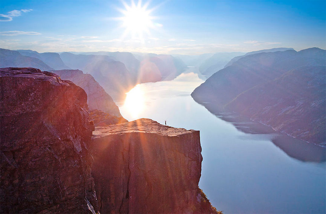 Le soleil qui se lève le matin sur le mont Preikestolen dans le Lysefjord