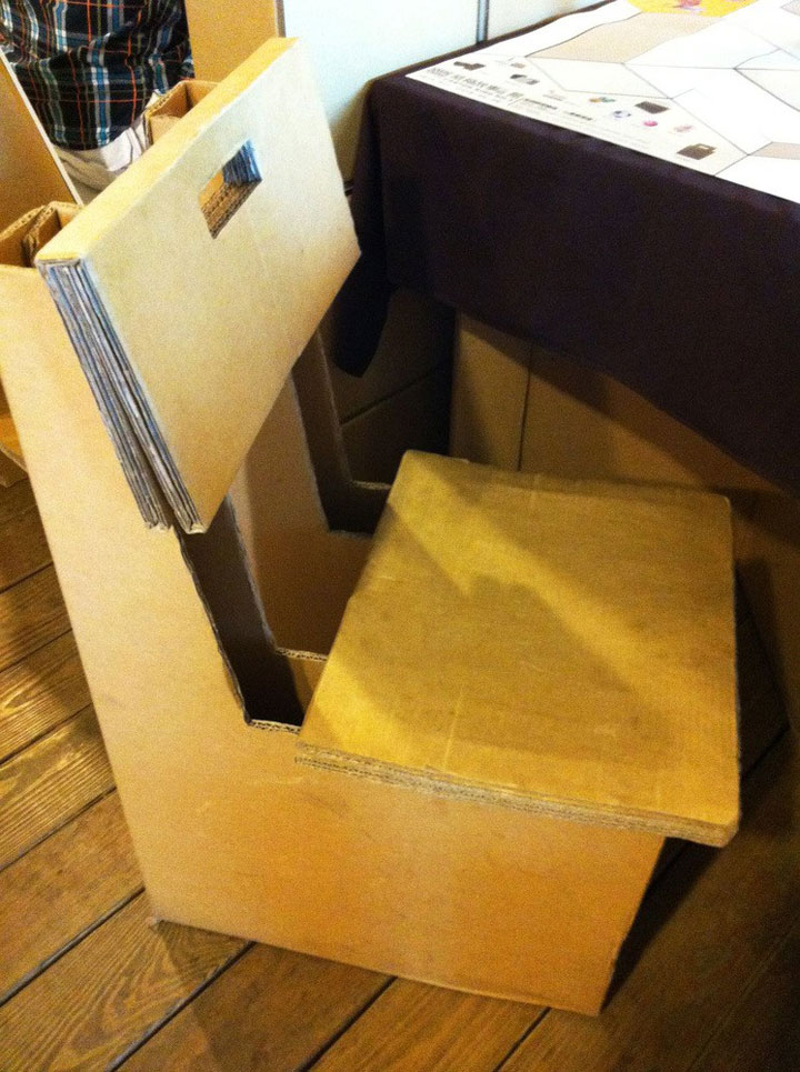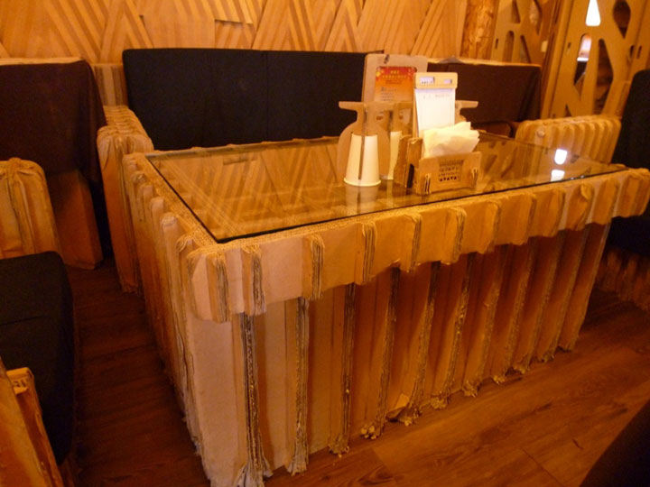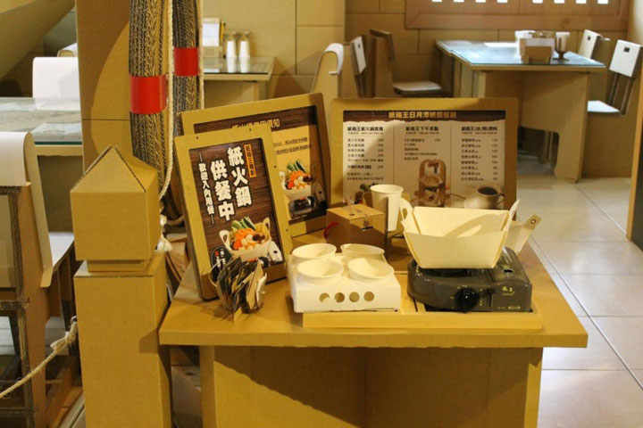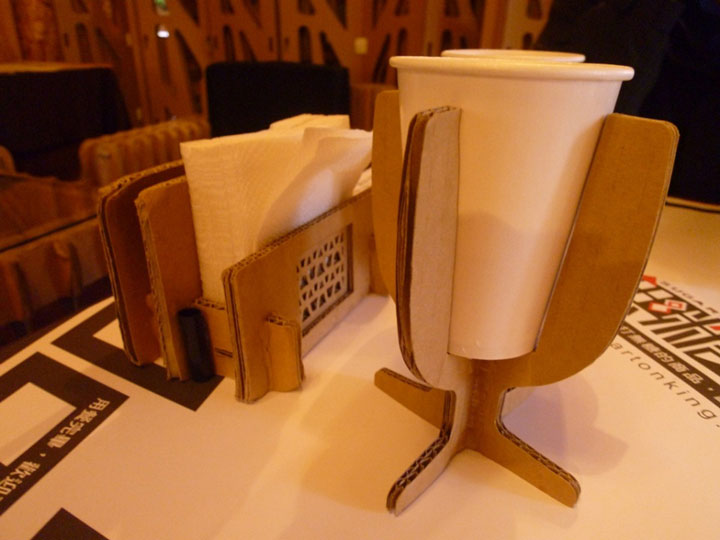 Situé à Taïwan et plus précisément dans la ville de Taichung, le restaurant Carton King offre à ses convives la possibilité de s’assoir sur une chaise entièrement faite de carton, comme tout le mobilier qui compose ce restaurant (tables, parois de cabines, distributeurs de papier hygiénique, bols, porte-gobelets…).