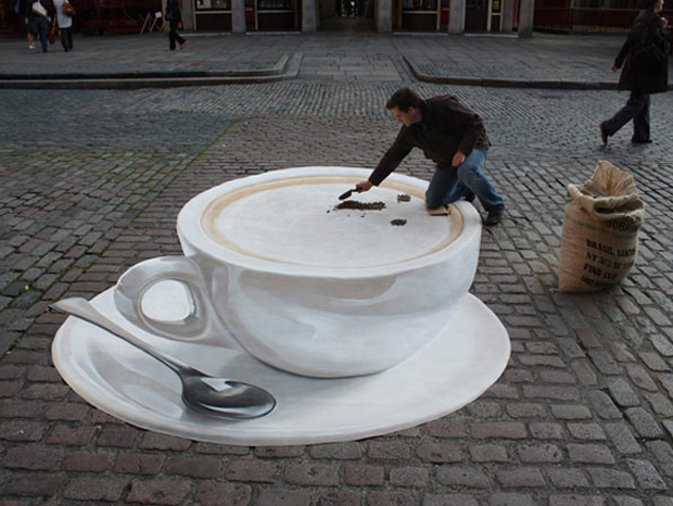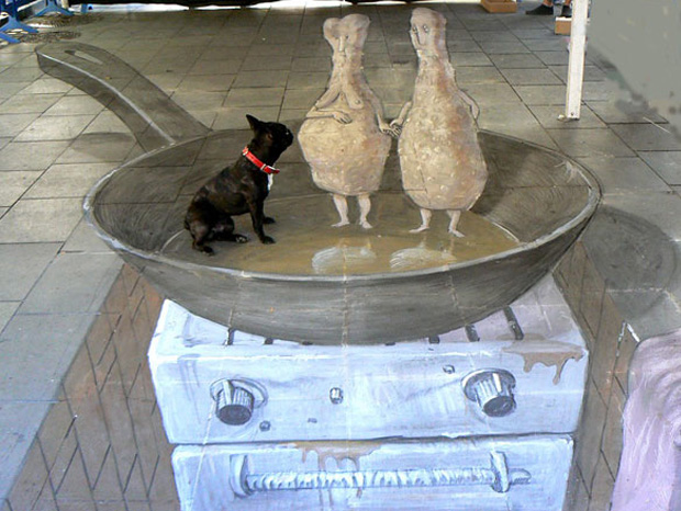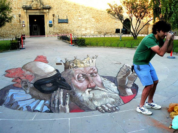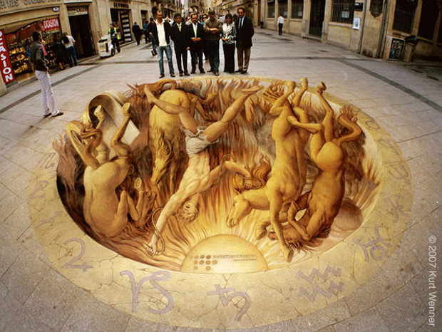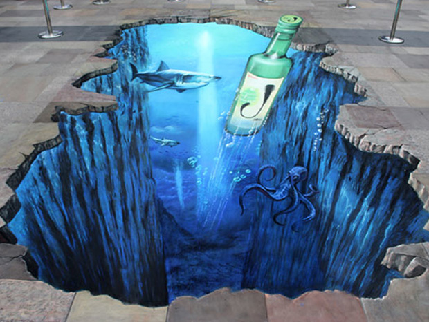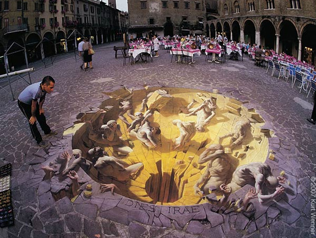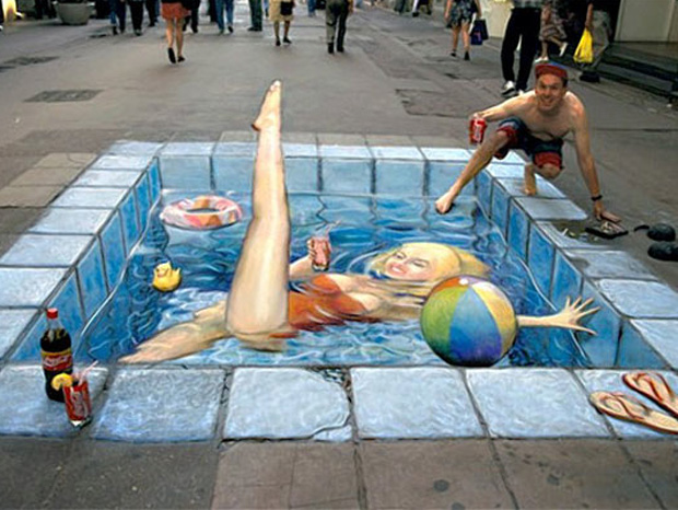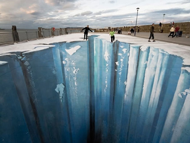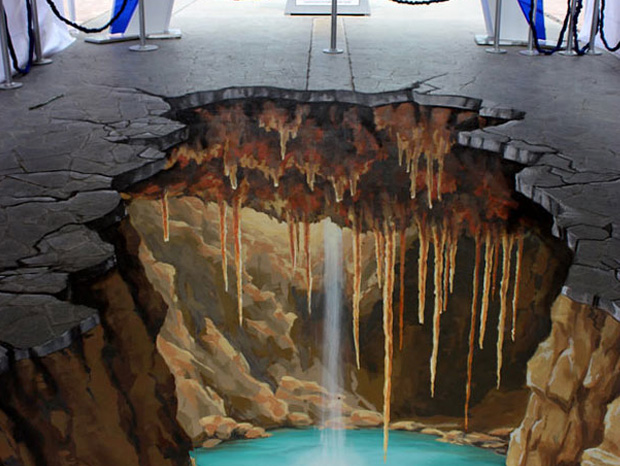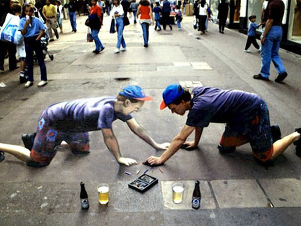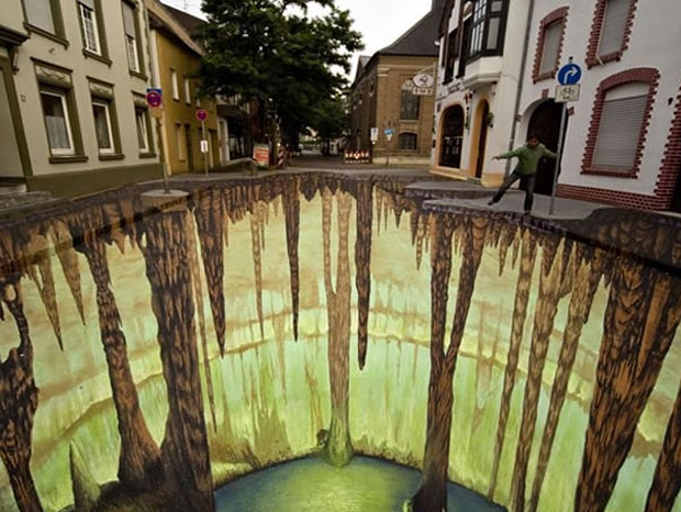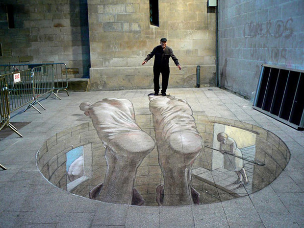 Julian Beever, artiste anglais de renom, habite en Belgique. Grâce à son talent en peinture, il a crée depuis 1990 des trompe-l’œil pastels qu’il a pris soin de réaliser sur les trottoirs. (son site)