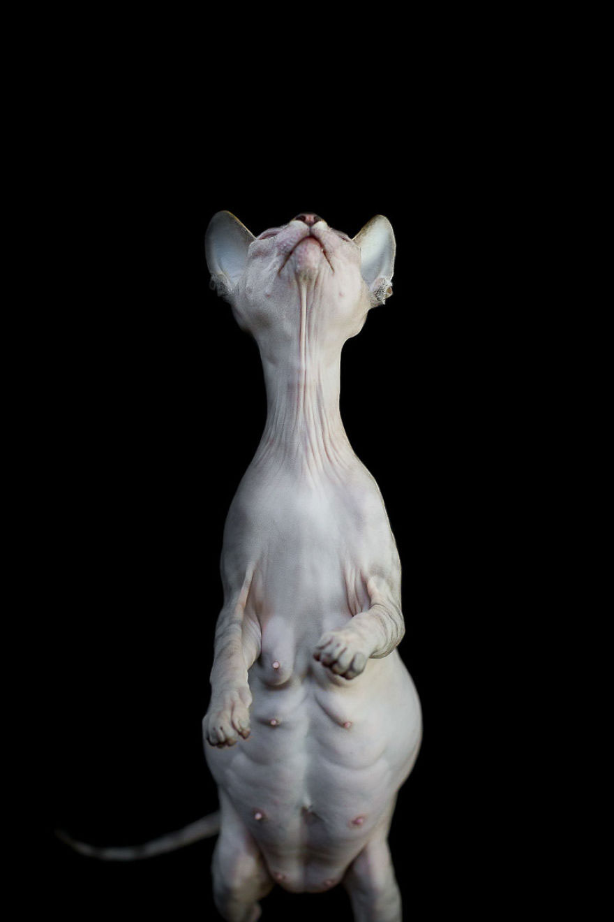 Alicia est fascinée par les sphynx. Elle explique : “Je suis attirée par leur look d’extraterrestre. Il y a quelque chose de troublant et d’étrange en eux qui m’étonne chaque fois que je les regarde. Sans couche fantaisiste de poils doux, cette race nous permet de voir ce qu’est un vrai chat. Tout en eux parait brut, exposé et vulnérable. Dès lors, mon travail a consisté à faire ressortir l’étrange beauté de ces animaux à travers des photographies.”