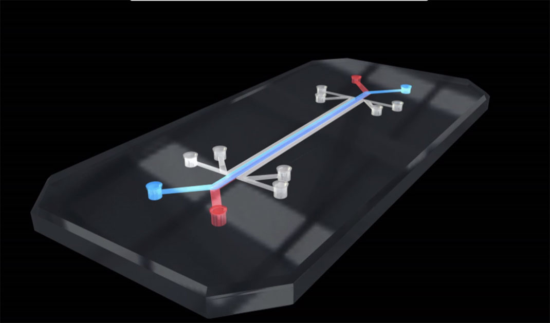 Des petits tubes émergent de petits blocs transparents, aspirant des quantités imperceptibles de liquide et d’air de long en large. Ce petit bout de silicone transparent est en fait un modèle d’organe qui va révolutionner le marché de l’industrie pharmaceutique en réduisant le besoin de tests sur les animaux et augmenter la vitesse de production de nouveaux médicaments.