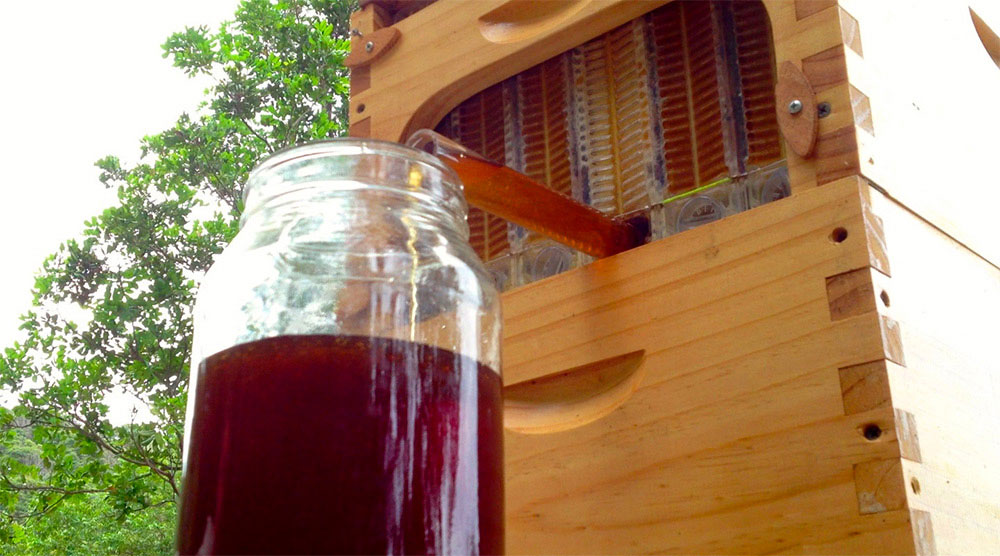 La ruche “Flow” en action avec ses tubes laissant le miel s’écouler :