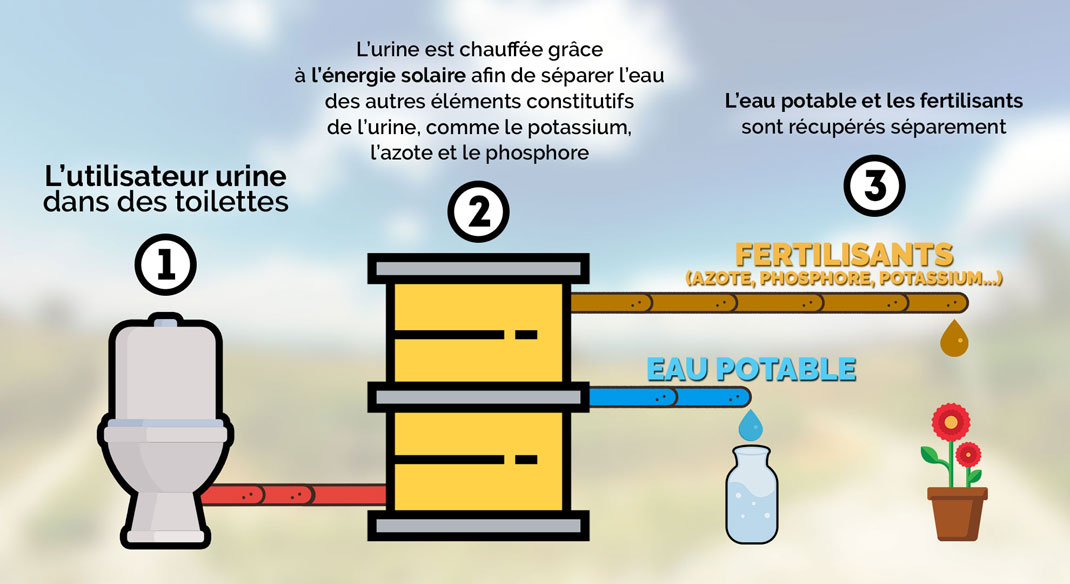 L’urine est collectée dans un grand réservoir, chauffée dans une chaudière à énergie solaire avant d’être filtrée par la membrane où l’eau est récupérée et les éléments comme le potassium, l’azote et le phosphore sont séparés.